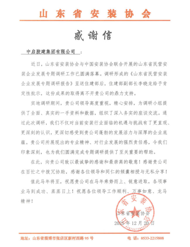 协会在信中特别提及,深切感受到中启胶建集团有限公司蓬勃的发展活力与深厚的企业底蕴,并祝愿集团各项事业蒸蒸日上。此次获赞既是行业对集团实力的认可,更是对全体员工的激励,让我们携手奋进,再创佳绩!