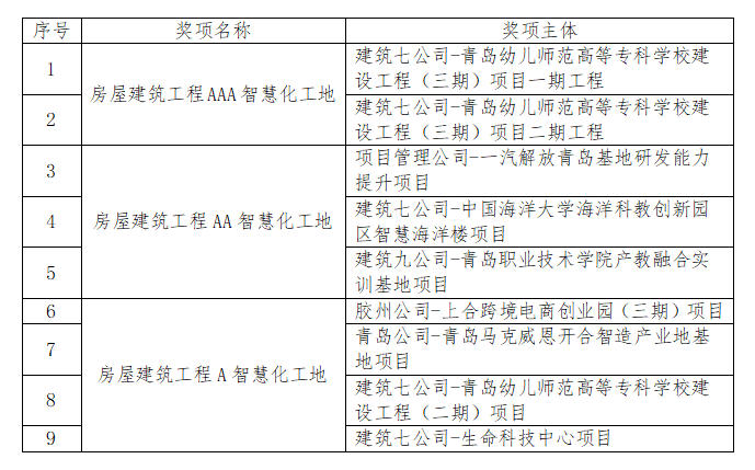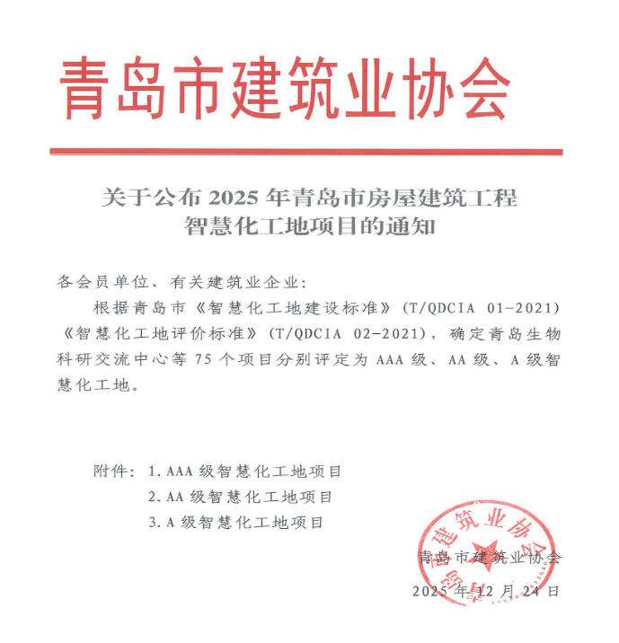 12月24日,青岛市建筑业协会公布了青岛市智慧化工地名单,公司凭借在智慧化施工领域的创新实践与突出成效,连续斩获多项荣誉,包括“房屋建筑工程AAA智慧化工地”、“房屋建筑工程AA智慧化工地”、“房屋建筑工程A智慧化工地”称号。这一系列荣誉的获得不仅彰显了公司在建筑施工智慧化转型中的领先地位,也为青岛建筑业高质量发展提供了创新样板。